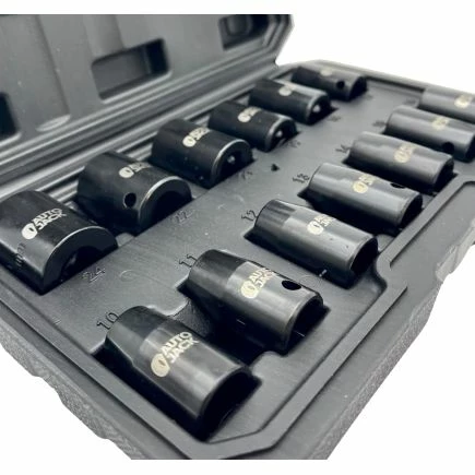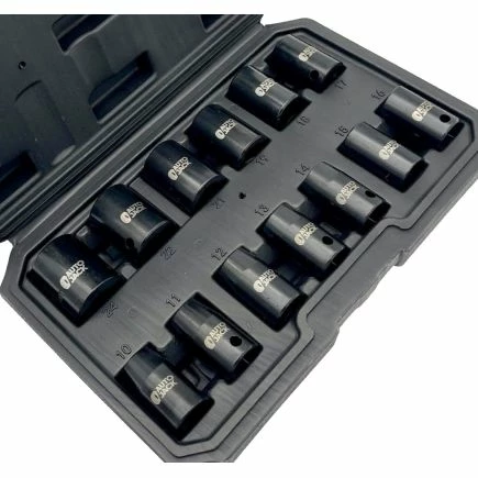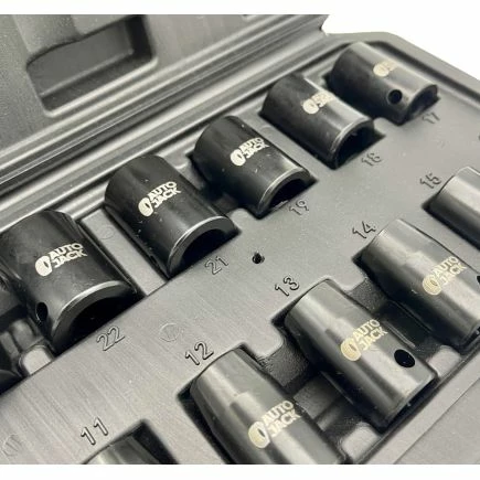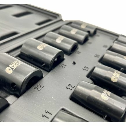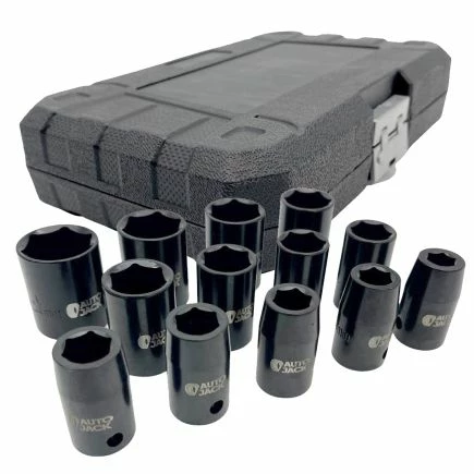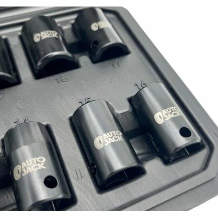 Autojack’s professional quality metric 13 piece impact socket set is manufactured from chrome vanadium steel, electrophoretically treated for Premium Quality strength and completed with a polished black phosphate finish providing up to two times the corrosion resistance of traditional socket sets!